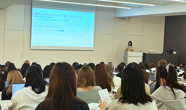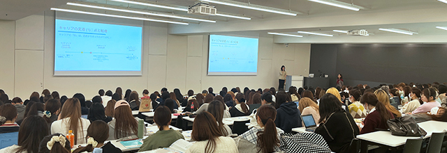 2025年11月12日、武庫川女子大学 経営学部の1年生237名を対象とした「キャリアデザイン特講I」(担当:経営学部 高橋千枝子教授)にて、当社執行役員の柴橋静華がゲストスピーカーとして登壇いたしました。本講義では、同大学のキャリア支援施設(資格サポート窓口・リカレント教育センターMUKOnoa+(ムコノアプラス))の運営に携わり、かつ企業の「採用・育成」研修にも携わる柴橋が、1年生の不安に寄り添い、一歩踏み出すためのメッセージを贈りました。